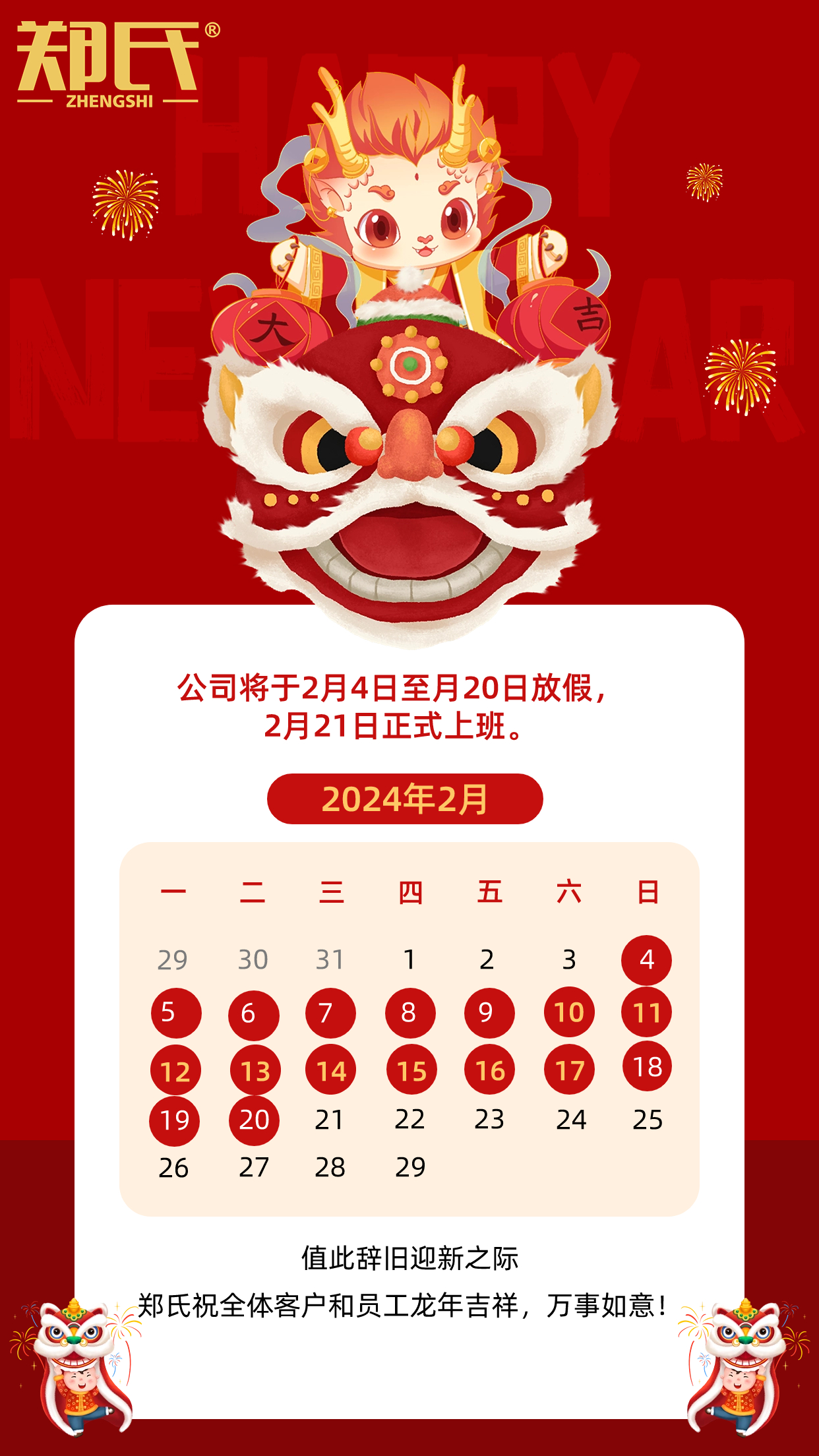 敲響的是鐘聲,走過(guò)的是歲月,留下的是故事,帶來(lái)的是希望。盼望的是美好,送來(lái)的是祝福。新春佳節(jié)來(lái)臨之際,鄭氏祝廣大客戶(hù)和全體同仁在2024年里事業(yè)有成,身體健康,萬(wàn)事如意,笑口常開(kāi)!愿您在新的一年里收獲滿(mǎn)滿(mǎn),幸福安康,好運(yùn)連連!